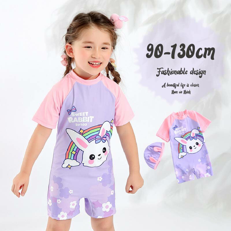 女の子 キッズ ウサギ レインボー フラワー プリント ファスナー ラグランスリーブ 半袖 帽子付き ワンピース 水着 / 2点セット 子供 温泉 スクール水着 練習用 スイムウェア 小学 入園グッズ 女児 幼稚園 水遊び おしゃれ 可愛い 90 100 110 120 130
